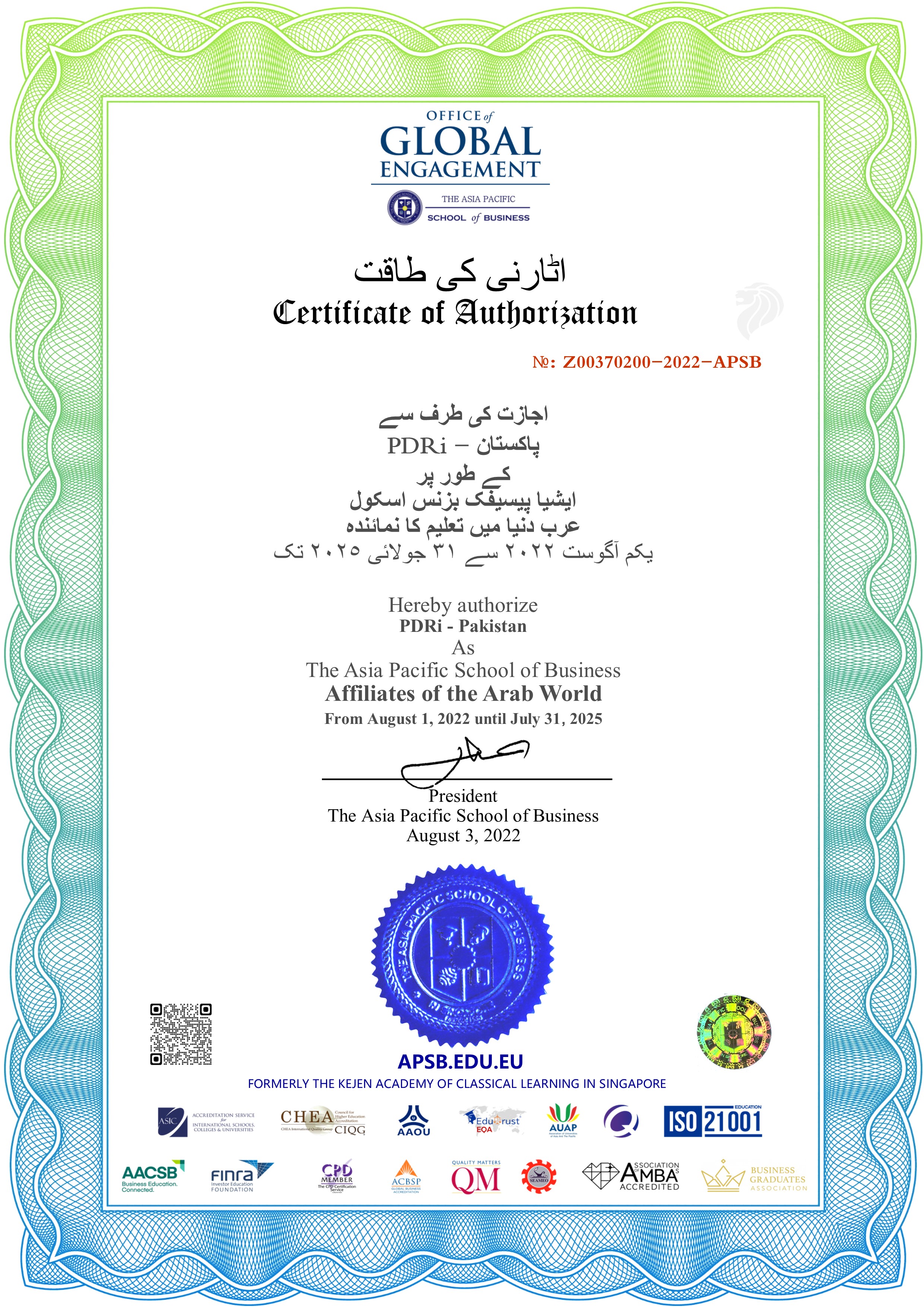 Under the agreement, AAGUC endorses the decisions of the APSB Board of Directors and Supervisory Board. Understand and support the academic accreditation of the APSB Academic Board and Degree Board. AAGUC recognizes PDRi-Pakistan.